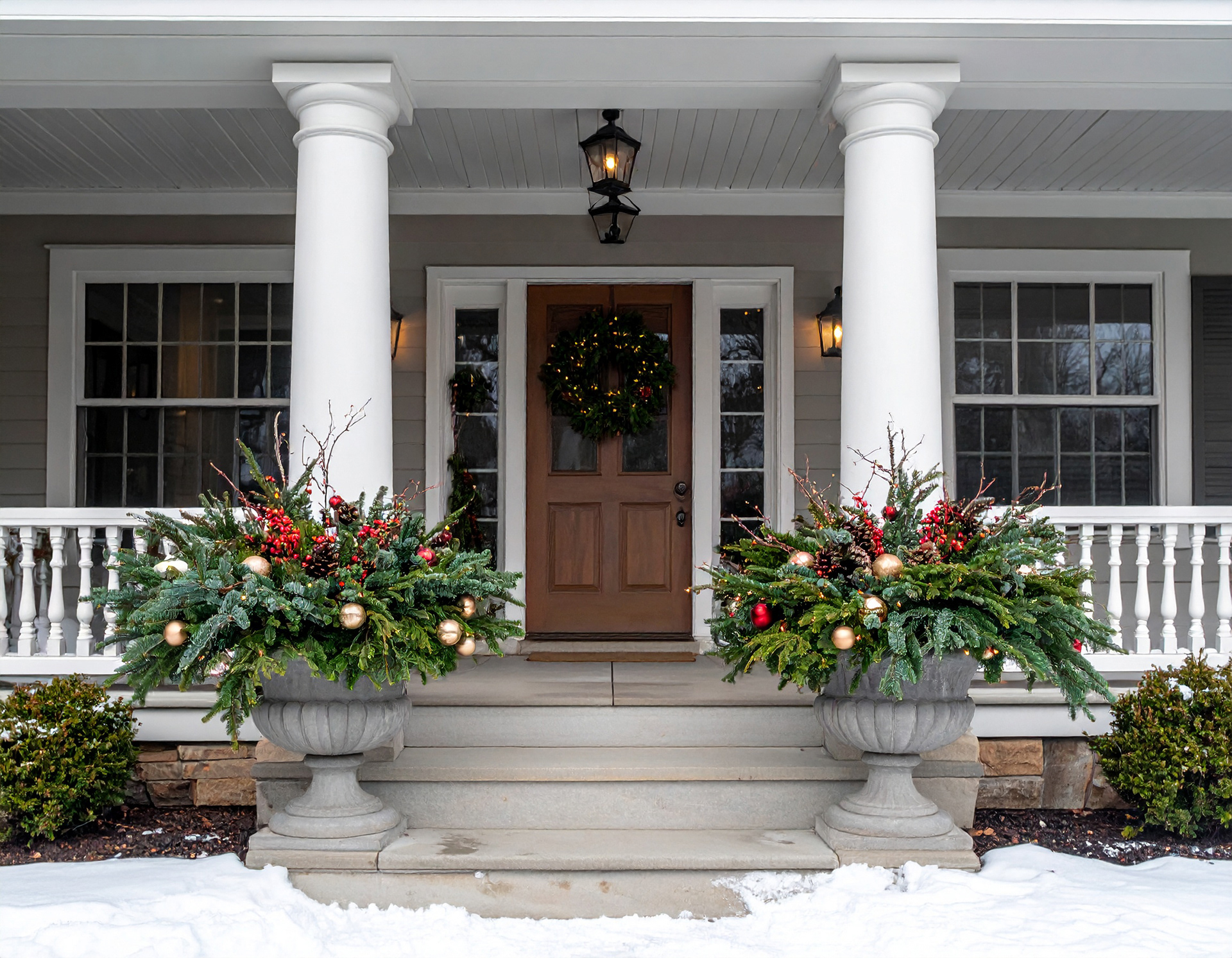 From a Holiday wreath that graces your front door, to planters filled with layers of evergreens, ornaments, and twinkle lights.